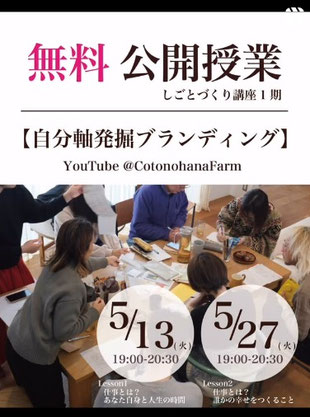 しごとづくり講座は、「自分軸発掘ブランディング」を通して、自分の価値観に気付き、得意なことや好きなことと組み合わせながら仕事づくりをしていく講座です。グループ講座では、ワーク中心の90分授業(12回)と、60分の個別オンラインセッション(5回)を実施。また、個人向けの「プライベート授業」もあります。詳しくはこちらまで。